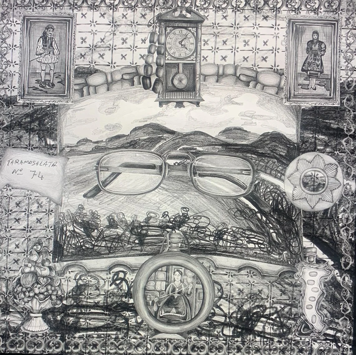 Hand drawn textile print for Iordanes Spyridon Gogos x Akira Isogawa AAFW 2023 show. Heirlooms from Gogos’ Papou and Yiayia’s home. Graphite pencil, digitised and collaged, printed on silk. Photography Jordan Drysdale.